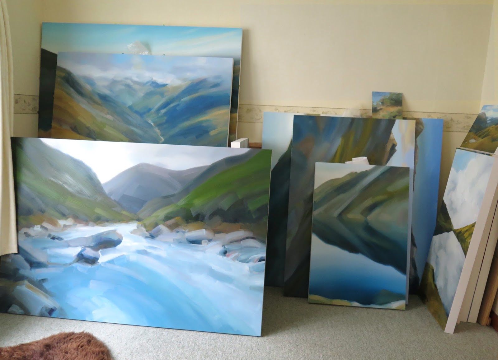 Running out of room for storing these large paintings before Parnell Gallery exhibition. I am liking the theme of blue coming through in these different paintings. Blue is an emotive colour- very calming and is evident throughout nature.